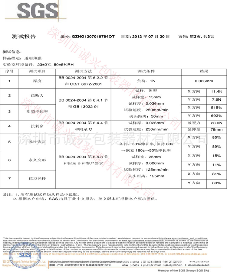 | 单位 | 测试方法 | 机用拉伸膜 | 手用拉伸膜 | 厚度 | μm | - | 15-50 | 10-50 | 比重 | G/cm3 | ASTMD1505 | 0.917 | 0.917 | 拉伸强度 | Kg/cm2 | ASTMD882 | ≥380 ≥250 | ≥300 ≥200 | 断裂伸长率 | % | ASTMD882 | ≥400 ≥700 | ≥350 ≥600 | 直角撕裂强度 | N/mm | HT | ≥75 ≥90 | ≥75 ≥90 | 粘性 | N/cm2 | HT | ≥0.8 | ≥0.8 | 雾度 | % | ASTMD1003 | ≤2 | ≤2 |