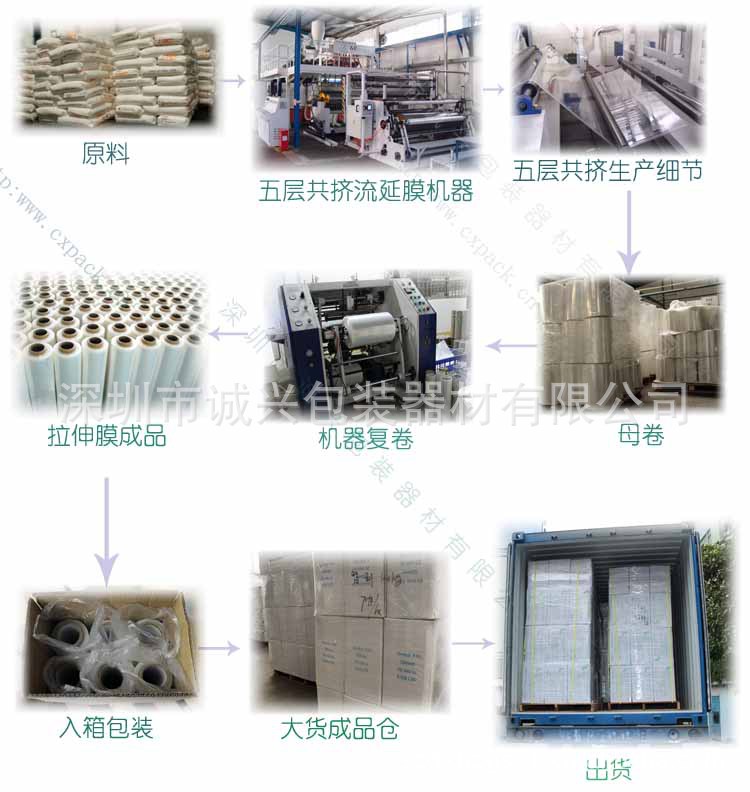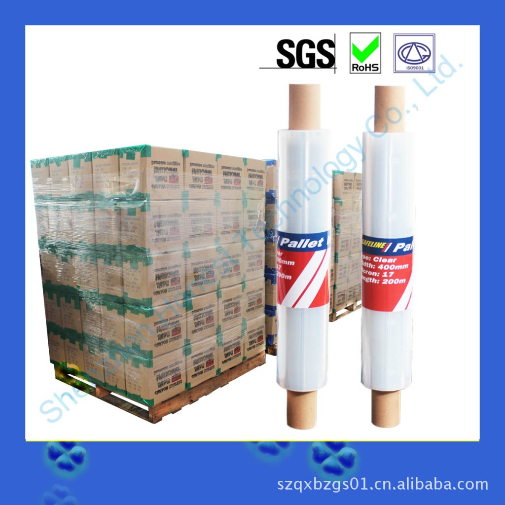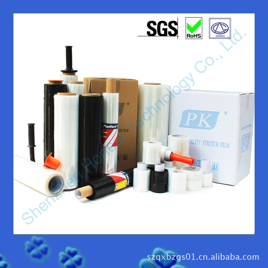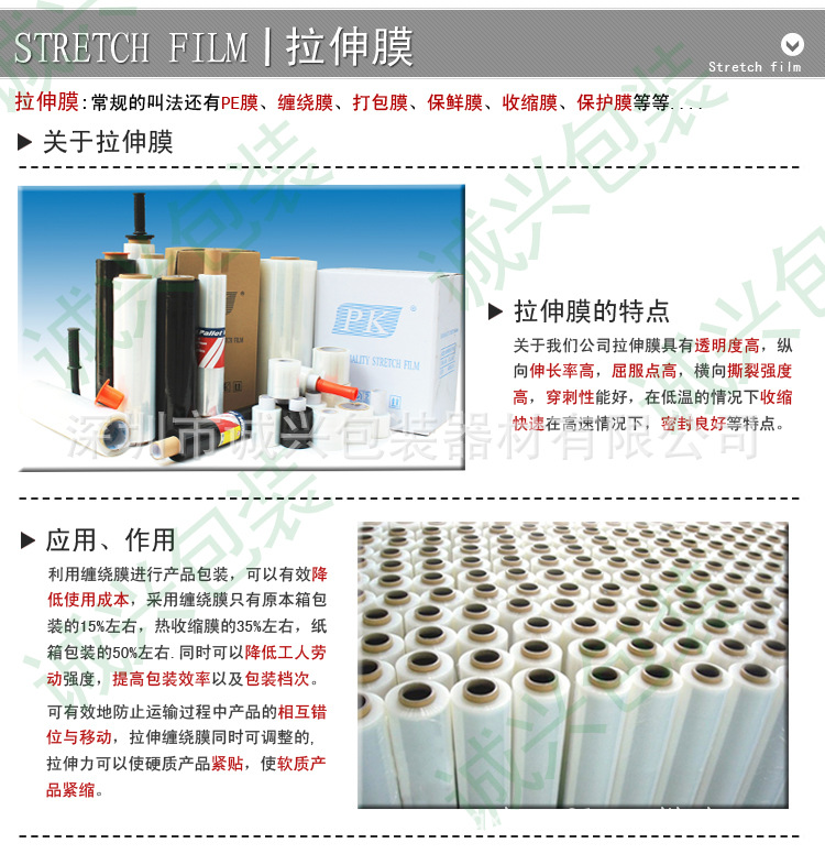 2、拉伸膜特点:(1)可拉伸性能强、预拉伸率达300%;(2)无毒、环保、防潮、防水、防尘、防腐蚀;(3)抗穿刺、抗撕裂性能强;(4)收缩记忆持久;(5)稳定可靠的自粘性能;(6)透明度高 3、拉伸膜分类: (1)、按用途分类:手用拉伸膜、机用拉伸膜、 (2)、按颜色分类:黑色拉伸膜、透明拉伸膜、乳白色拉伸膜、蓝色拉伸膜。 (3)、按重量分类:小于净重5KG为手用,大于5KG净重为机用。 本厂家专业生产拉伸膜,透明手用拉伸膜常有各种规格库存: 450MM*20U*2.0KG净重*0.5KG纸芯, 450MM*20U*2.2KG净重*0.5KG纸芯, 450MM*20U*2.5KG净重*0.5KG纸芯, 450MM*20U*3.0KG净重*0.5KG纸芯 机用常有各种规格库存:500MM*12KG净重*1KG纸芯,500MM*13.5KG净重*1KG纸芯 4、质量认证:产品全部通过SGS质量认证,【质量保障】