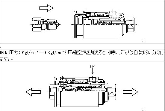 | 接続はプラグを押し込むだけでワンタッチ接続します。 | | | | | | | | | INに圧力5Kgf/cm² ― 6Kgf/cm²の圧縮空気を加えると同時にプラグは自動的に分離します。 | | | | |