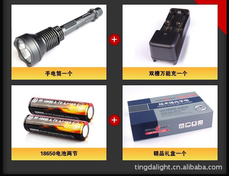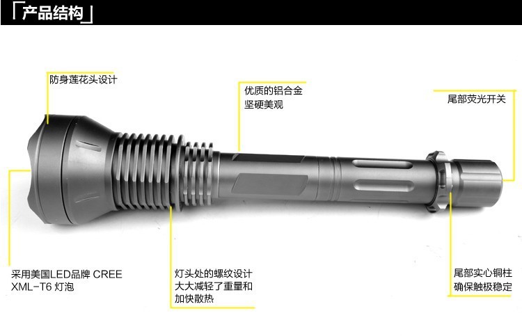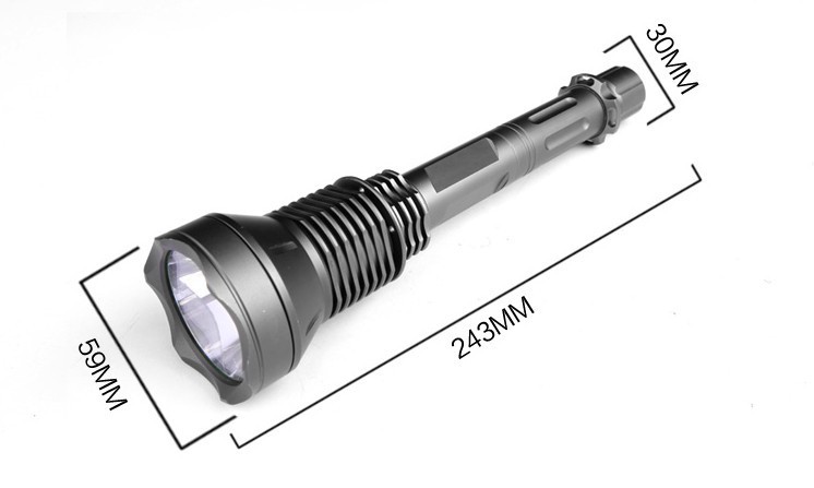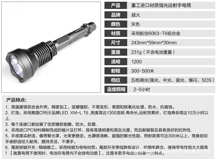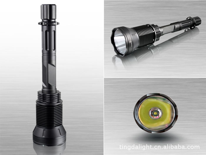 超强光2300流明铝合金手电筒采用最新的美国流明公司SST-90大功率LED灯,亮度可达2300流明;5档电流智能数字线路控制; (1).强光:工作电流 6500mAh,亮度 2300 流明; (2).中档:工作电流 2000mAh,亮度 1500 流明; (3).低档:工作电流 800mAh,亮度 500 流明; (4).闪光:工作电流 5000mAh,亮度 2000 流明; (5).SOS模式:工作电流 6500mAh,亮度 2300 流明;全金属材料桔皮效果反光杯,耐高温不散光,避免黑斑和不聚光;材料:T6061航空铝合金,全CNC高精度加工;采用3颗18650可充电锂电池充电;连续工作时间超过1小时;O型圈防水设计