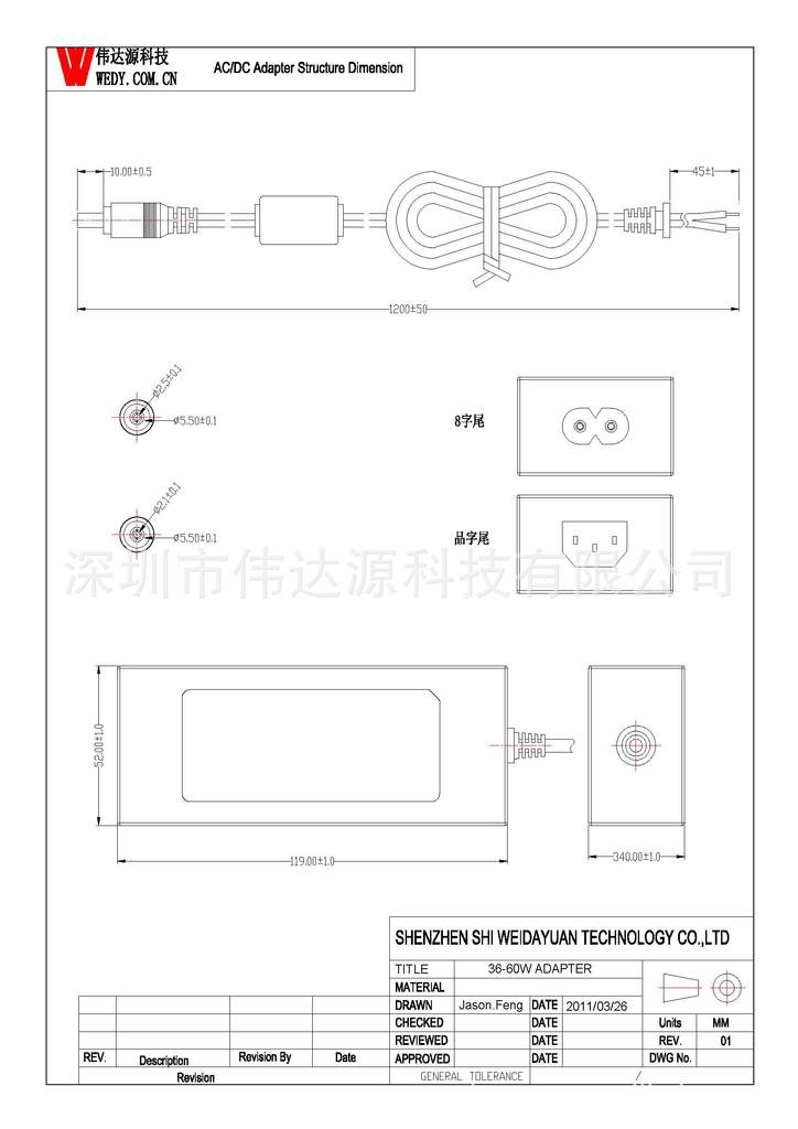 DC线: AWM 1185 18AWG*2C,VW-1,80℃,FTI,300V,线上有字,总1.2米,带环加5.5*2.1公头