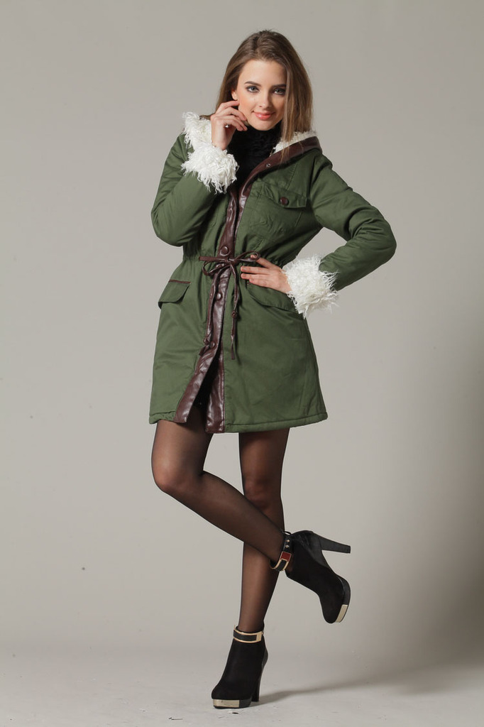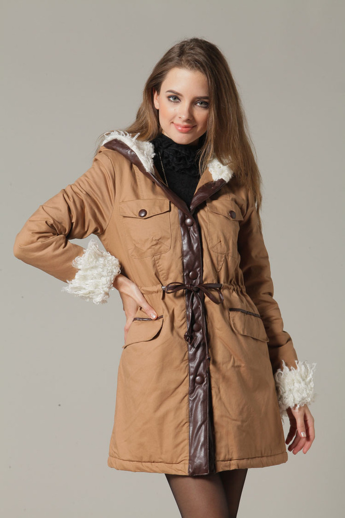 冬季新款连帽PU皮镶边拼接收腰修身中长款品牌棉衣批发W077