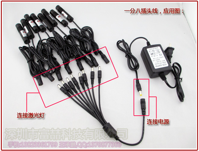 一分八DC插头线,适合将激光灯专用开关电源的输出插头分为8个接口,以满足同时接8个激光灯的需求,插头线导线长度32厘米。