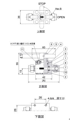 | | 型 式 | (A) (㎜) | B (㎜) | オリフィス径 (㎜) | 接続チューブ径 (㎜) | NSV-PV-8F-V | (78) | 六角14 | ø6 | ø8×ø6 | NSV-PV-10F-V | (85) | 六角22 | ø8 | ø10×ø8 | NSV-PV-12F-V | (93) | 六角25 | ø10 | ø12×ø10 |