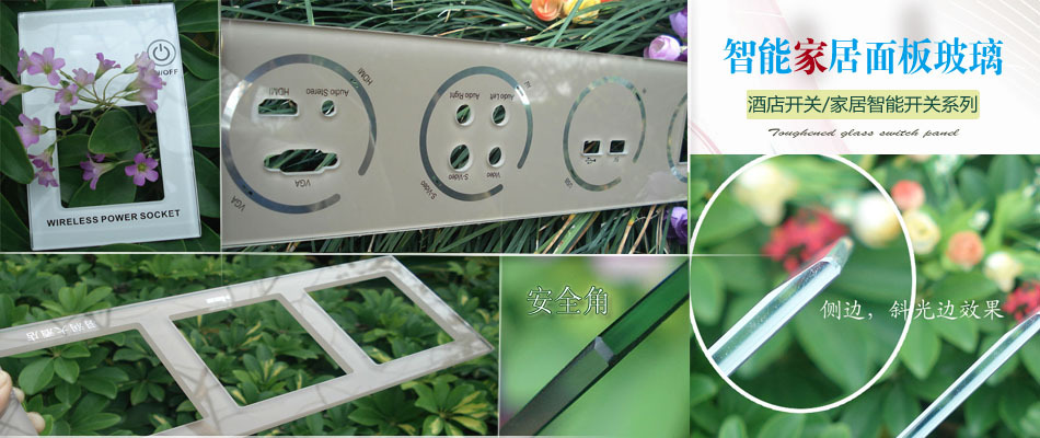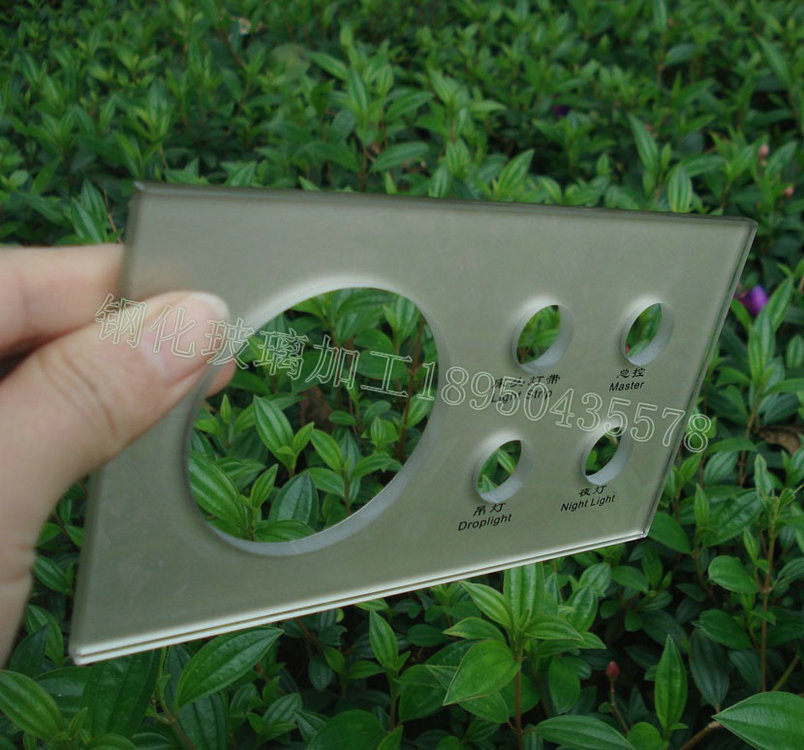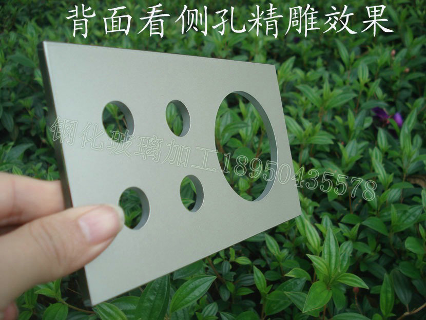 ④开关插座方形孔,或者异形通孔的,也可以内框精雕处理;玻璃四周均为高亮光边,全钢化,来图加工各种非标规格及常规尺寸;