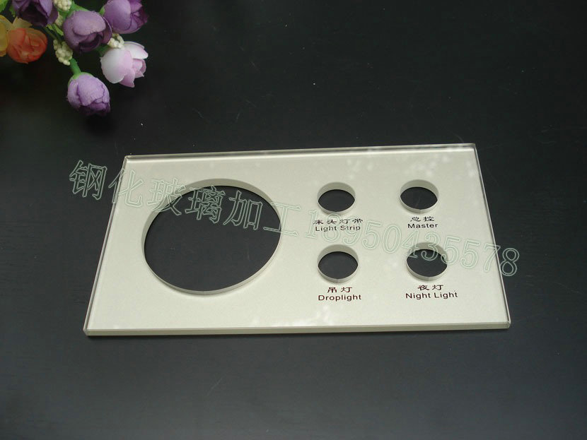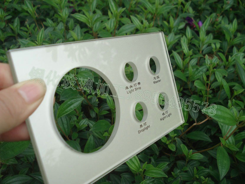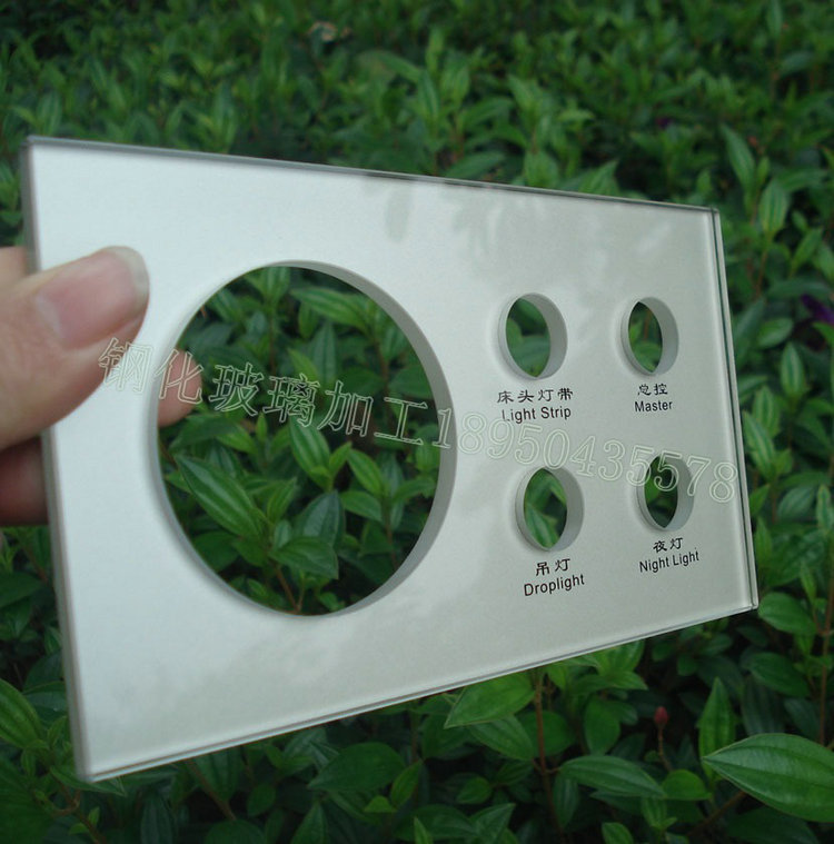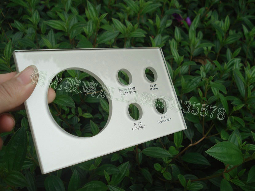 ④开关插座方形孔,或者异形通孔的,也可以内框精雕处理;玻璃四周均为高亮光边,全钢化,来图加工各种非标规格及常规尺寸;⑤玻璃厚度可选择为:1.1mm、1.5mm、2 mm 、3 mm 4mm、5 mm、 6mm;