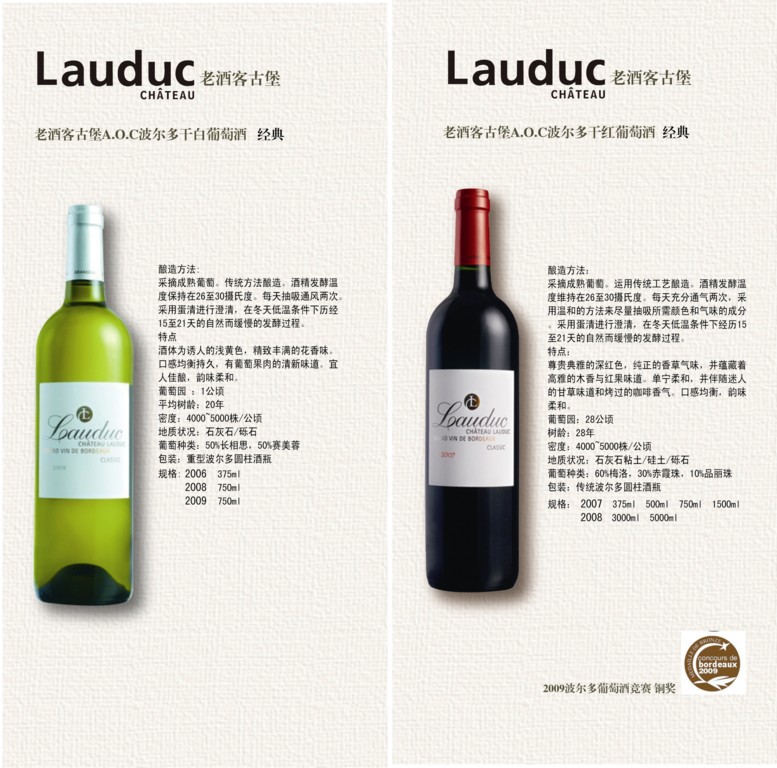 我公司旗下的法国“老酒客古堡”采用的葡萄均为名贵品种,拥有最现代化的葡萄酒酿制酒窖和最先进的酿酒工艺,所出产的红葡萄酒,以其鲜红亮丽的色泽,精致丰满的香味,柔和芳醇的单宁,均衡和谐的酒体著称。所产白葡萄酒鲜亮明媚,果味怡人,酒香雅致,如花瓣般氤氲绽放。“格莱莉特”葡萄酒玫瑰色泽,鲜亮柔和, 采用蒸馏桶渗色之法精工酿造,口感均衡饱满、香醇浓郁。老酒客葡萄酒曾在波尔多葡萄酒竞赛中荣获多项奖项。