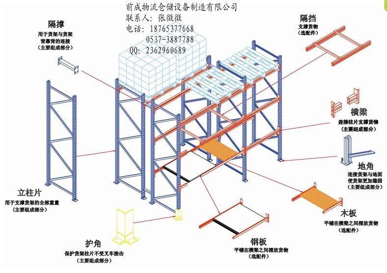 B、横梁:由两只柱卡与横梁杆焊接在一起,横梁杆采用两特制的“C”型钢抱合而成,使梁的上、下面厚度加厚一倍,这种结构根据钢结构设计理论,充分利用了材料的抗载容量,具有重量轻,承载力强,成本低的特点。横梁与立柱连接时配有特殊设计的带耳片安全销,这种带耳片安全销无法轻易拔出,可以确保横梁在外力撞击后不会脱落;