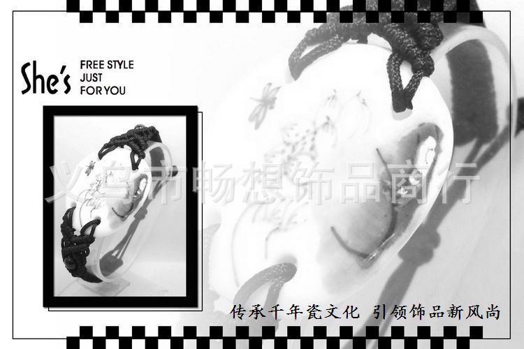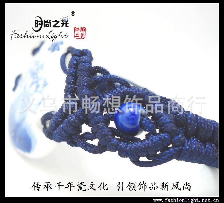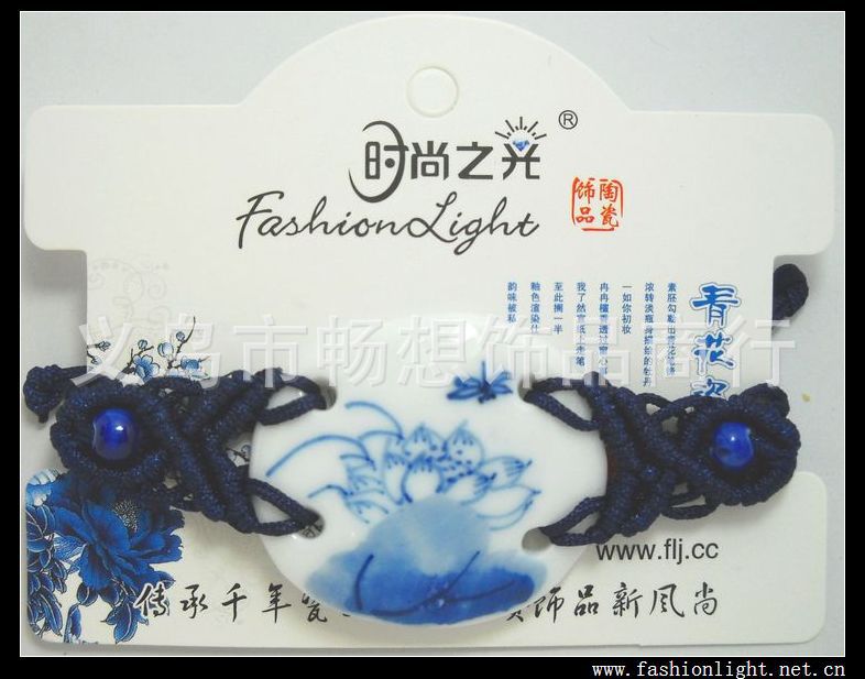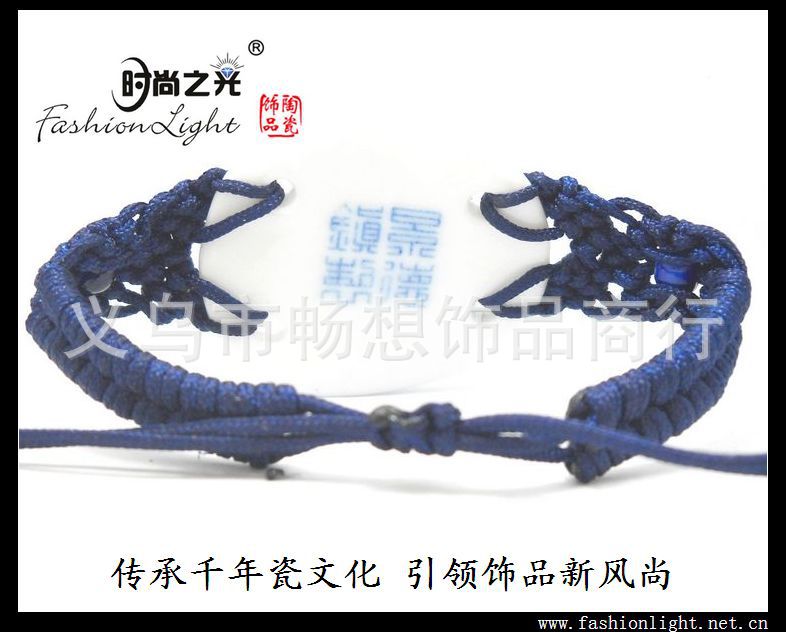 | | 产品名称 | 时尚之光陶瓷饰品 | 编织材质及长度 | 韩国蜡线、16CM(主带身)+10CM(延长部分) | 主体材质 | 陶瓷高温 | 瓷片尺寸 | 40*35MM | 工艺技术 | 白瓷手绘 | 包装及规格 | 简易包装(有效果图片)、卡片规格9.7*7.5CM |