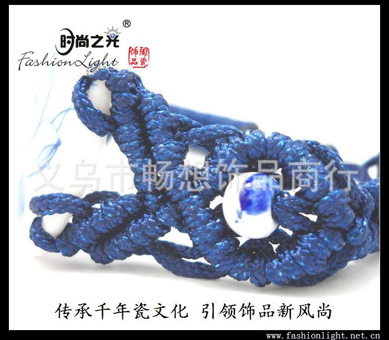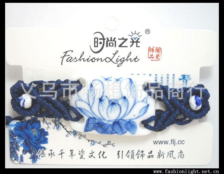 | | 产品名称 | 时尚之光陶瓷饰品 | 编织材质及长度 | 韩国蜡线、16CM(主带身)+10CM(延长部分) | 主体材质 | 陶瓷高温 | 瓷片尺寸 | 39*27MM | 工艺技术 | 白瓷手绘 | 包装及规格 | 简易包装(有效果图片)、卡片规格9.7*7.5CM |