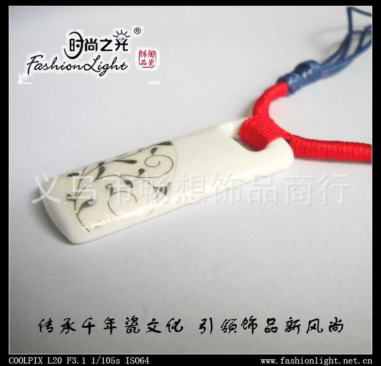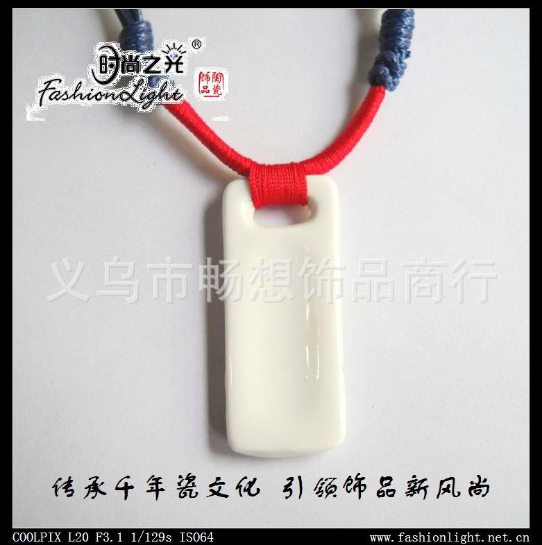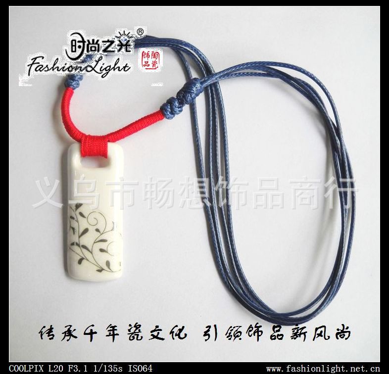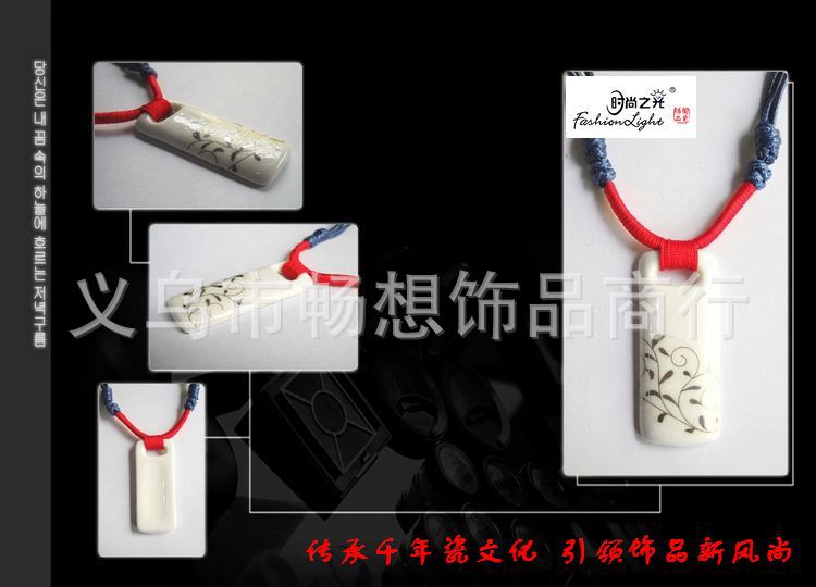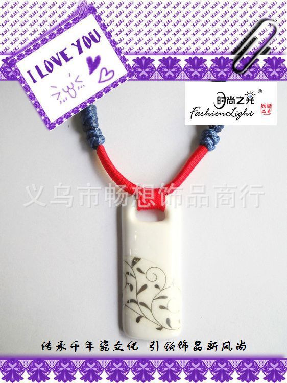 | | 产品名称 | 时尚之光陶瓷饰品 | 链子材质及长度 | 韩国蜡线、伸长可做毛衣链 | 坠子材质 | 陶瓷 | 坠子尺寸 | 52*21MM | 工艺技术 | 白瓷贴花纸 | 包装及规格 | 简易包装(有效果图片)、卡片规格20*5.5CM |