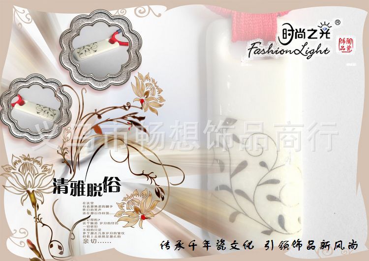 一.关于时尚之光 时尚之光是年轻的饰品品牌,秉承"传承千年瓷文化,引领饰品新风尚"为理念。此品牌的持有者义乌市畅想饰品商行立足世界小商品之都,拥有专业的产品研发设计团队和完善的加工生产线,经营产品总类丰富,涵盖青花瓷系列,粉彩瓷系列,喷彩描金系列,青花描金系列,车挂系列,钥匙扣系列,书签系列,化妆镜系列,产品极具创意,是传统瓷文化和现代时尚元素的完美融合。个性张扬的你,还在等什么?FASHION LIGHT WITH YOU! 二.产品细节及包装效果图