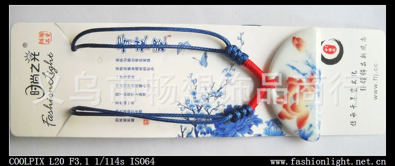 一.关于时尚之光 时尚之光是年轻的饰品品牌,秉承"传承千年瓷文化,引领饰品新风尚"为理念。此品牌的持有者义乌市畅想饰品商行立足世界小商品之都,拥有专业的产品研发设计团队和完善的加工生产线,经营产品总类丰富,涵盖青花瓷系列,粉彩瓷系列,喷彩描金系列,青花描金系列,车挂系列,钥匙扣系列,书签系列,化妆镜系列,产品极具创意,是传统瓷文化和现代时尚元素的完美融合。个性张扬的你,还在等什么?FASHION LIGHT WITH YOU! 二.产品细节及包装效果图