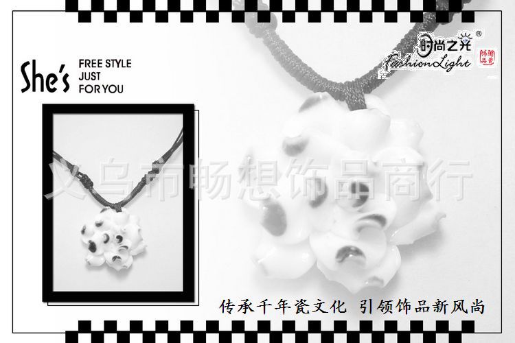 | | 产品名称 | 时尚之光陶瓷饰品 | 链子材质及长度 | 韩国蜡线、伸长可做毛衣链 | 坠子材质 | 陶瓷 | 坠子尺寸 | 32MM | 工艺技术 | 纯手工 | 包装及规格 | 简易包装(有效果图片)、卡片规格20*5.5CM |