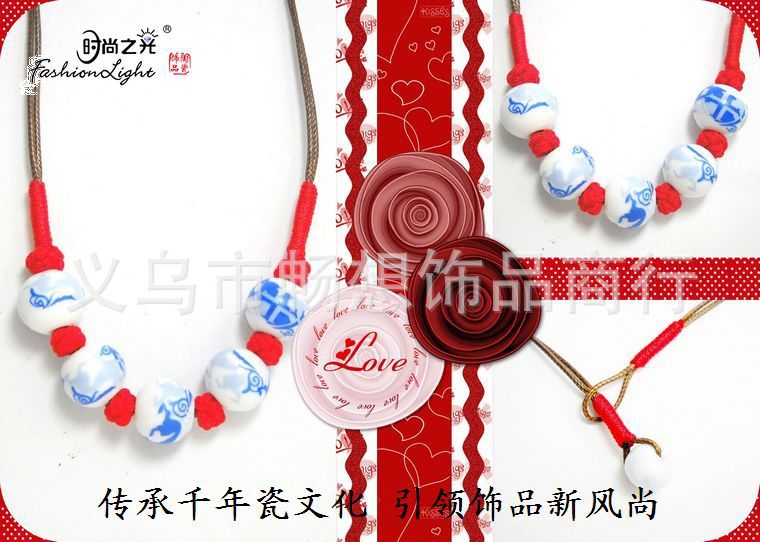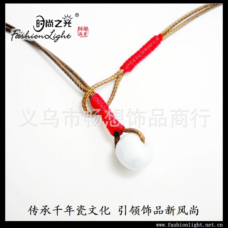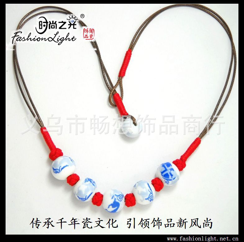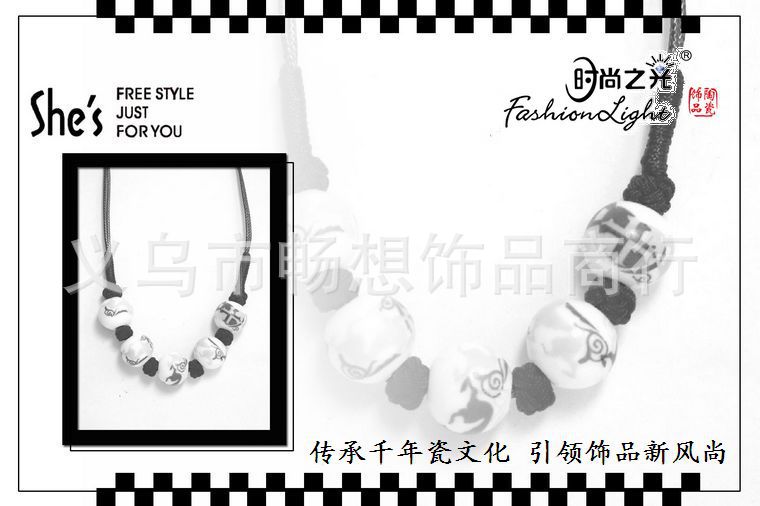 | | 产品名称 | 时尚之光陶瓷饰品 | 链子材质及长度 | 韩国蜡线、长47CM | 坠子材质 | 陶瓷 | 瓷珠尺寸 | 12MM | 工艺技术 | 白瓷贴花纸 | 包装及规格 | 简易包装(有效果图片)、卡片规格20*5.5CM |