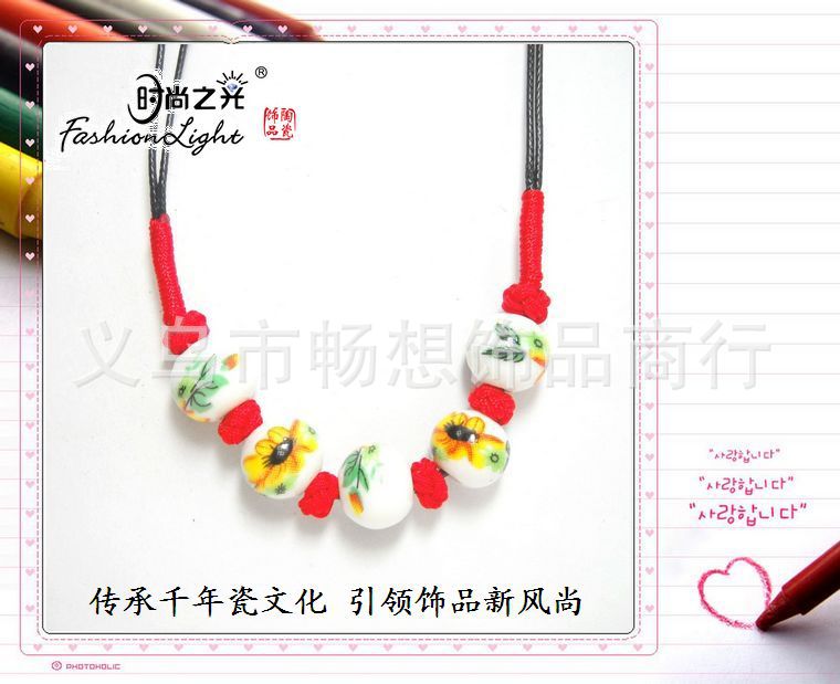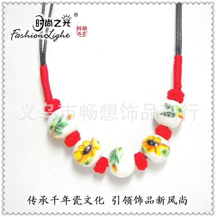 | | 产品名称 | 时尚之光陶瓷饰品 | 链子材质及长度 | 韩国蜡线、长47CM | 坠子材质 | 陶瓷 | 瓷珠尺寸 | 12MM | 工艺技术 | 白瓷贴花纸 | 包装及规格 | 简易包装(有效果图片)、卡片规格20*5.5CM |