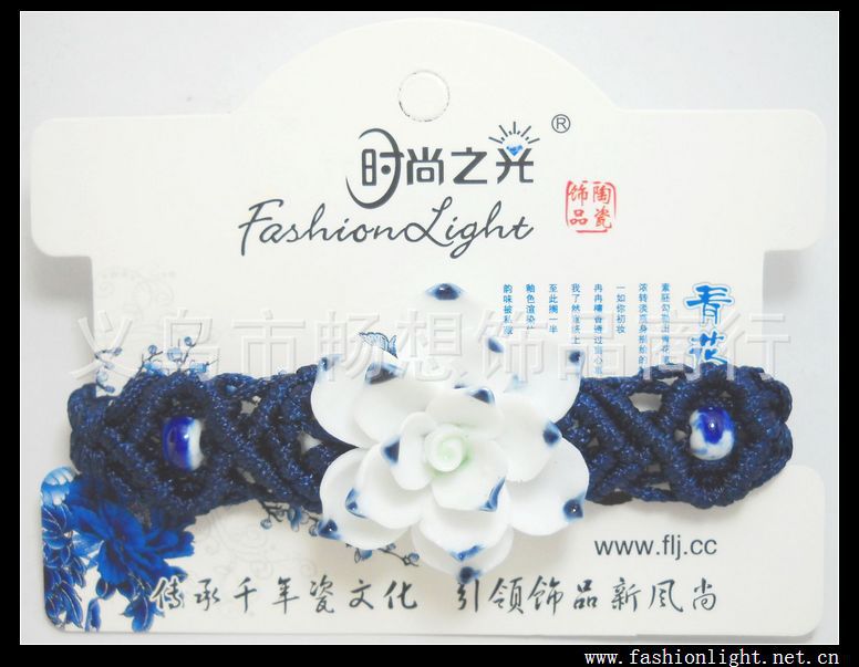 | | 产品名称 | 时尚之光陶瓷饰品 | 编织材质及长度 | 韩国蜡线、16CM(主带身)+10CM(延长部分) | 花的材质 | 陶瓷高温 | 花的直径 | 35MM | 工艺技术 | 纯手工堆捏 | 包装及规格 | 简易包装(有效果图片)、卡片规格9.7*7.5CM |