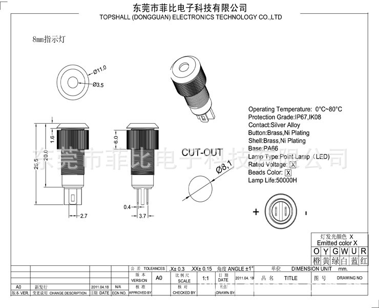 厂家直供8mm蓝色Led防水金属指示灯