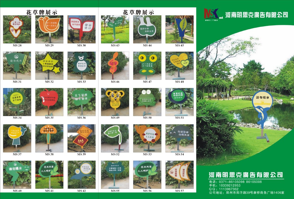 河南明思克广告有限公司长期供应:花草牌 、小草牌、草地牌、草坪牌、花草指示牌、温馨提示牌、绿化警示牌、 环境标识牌、小区花草牌、花草标识牌、防锈防腐花草牌、花草牌设计制作、草坪牌等高档装饰导向牌。本系列适用于:园林、景观、公园、小区、学校、工业园区等环境保护领域。花草牌采用的工艺:1、冷轧钢板折弯焊接成型;2、汽车环氧底漆、汽车面漆,3、精密丝网印刷。产品外观精致高雅,美观大方,适合用于各种环境保护宣传。本公司产品种类齐全,款式新颖,满足客户在各个层面的需求。公司将以更新的创意、更好的质量、更佳的服务、更优的价格、更快的速度与您携手共铸辉!