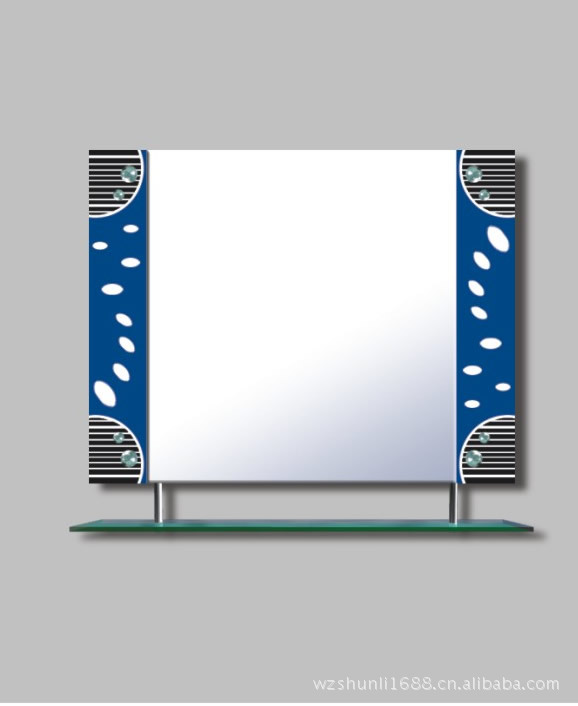 - 描述:此款浴室镜属于组合镜,喷砂喷漆,贴钻,带玻璃台板,由镜夹固定。原片为高档5mm银镜,具有防潮,防水,防霉等特性。磨边样式多种可选,镜子表面清晰,无划伤,无变形,无杂物,透视度好。占用空间小,美观大方,是各家各户浴室之首选。