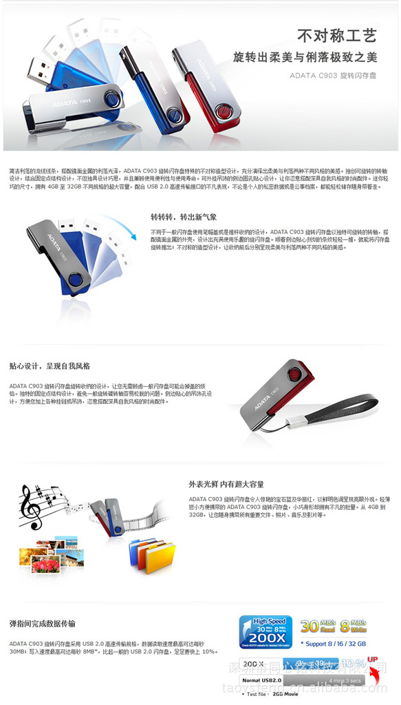 1.所有U盘产品均原厂直销,全部机芯采用进口的A级FLASH芯片,主要品牌三星(Samsung),东芝(TOSHIBA),英特尔(INTEL),镁光(Micron)等等支持专业人士的测试与评估。 2.可根据客户的要求印制厂家或公司的Logo贴牌 和外包装的定做,量大者可免费开模,需要特殊新颖款式的我们的设计师可以帮您画图,设计,做出您满意的U盘。可直接发国内香港、澳门、台湾地区即国外专线。 3.所有U盘出厂前我们都会经过严格的检测,确保所有产品的质量。 |