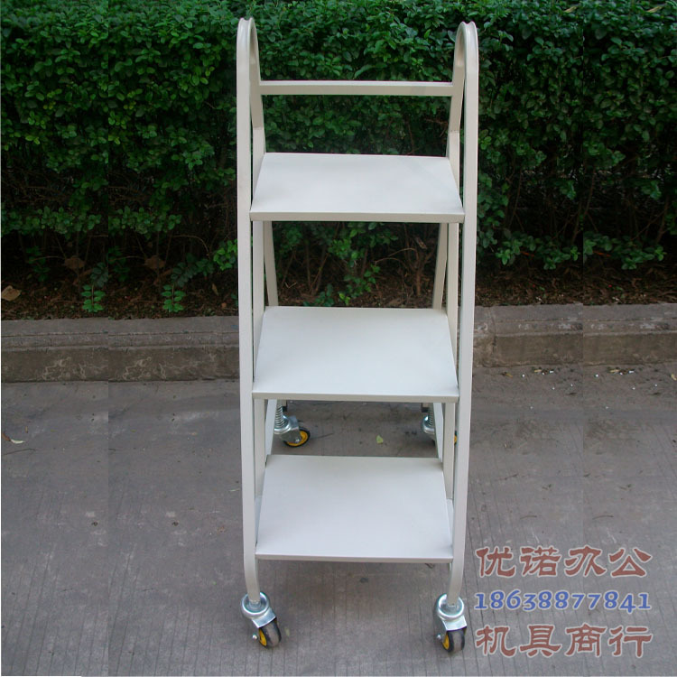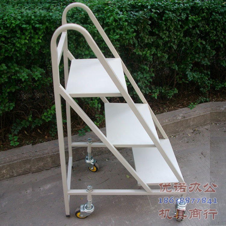 图书馆三步登高梯实物图 图书馆三步书梯外部尺寸:1030*400*650 管理员站立,弹簧自动下压,可自由移动。 可按客户要求安装尼龙轮,聚氨酯轮,橡胶轮(静音轮子) 生产车间可按客户要求定做(20台以上) 厂家直销,量大从优 可定做外贸书车书梯详情:【名称】三步书梯【规格】高1030*宽400*深650mm【轮子配置】3寸轮(可按客户要求安装静音轮)【颜色】亚光灰白【承重】每层承重80公斤【用途】书车/书梯为文件存放、图书装具的附加配套产品,能充分发挥密集架、书架的储物功能,更使产品的使用者存取自如,方便快捷。适合图书馆、商场,书店,报刊店,办公室放书报用,节约空间,方便拿取。【特性】 1、本梯可根据客户喜好进行各种颜色的静电喷涂和烤漆,颜色多样,随心而定,更漂亮,更耐用;2、本梯可根据客户需要定制各种尺寸规格。
