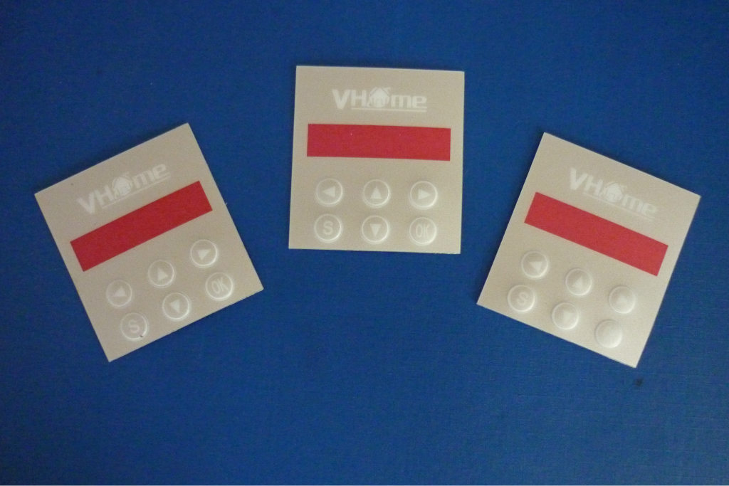 本公司产品外形美观,色彩鲜艳丰富,套位准确,设计可随心所欲,字符图案不受损伤,可以充分体现产品本身风格个性化。按键位可以热压鼓包,也可以挖孔不带鼓包按键;表面可以印UV,覆保护膜;后面可以背胶;尺寸精准,寿命长,进口材料的按键使用次数百万以上;具有良好的密封性,防水、防尘、防油污、耐摔、抗震、安装方便 ;也可以根据客户需要提供均符合欧盟(ROHS)、及无卤环保认证要求的产品