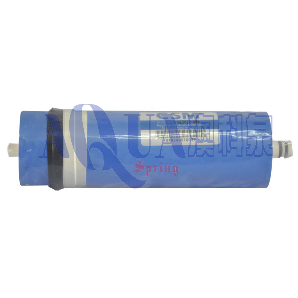 功能:利用超静压力泵产生高压渗透,使水分子和离子态的矿物质元素通过一层逆渗透膜,而溶解在水中的绝大部分重金属、有机物以及细菌、病毒等则无法透过逆渗透膜被截留(逆渗透膜上的孔径只有0.0001μ微米,而病毒的直径一般有0.02-0.4μ微米,普通细菌的直径有0.4-1μ微米)