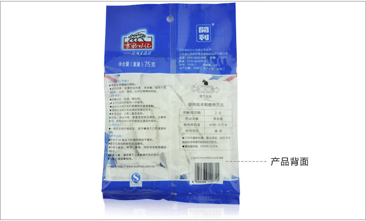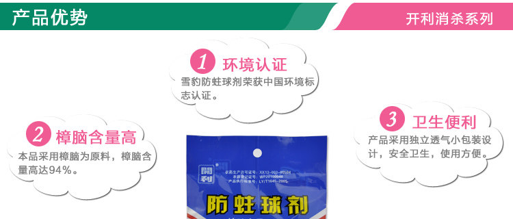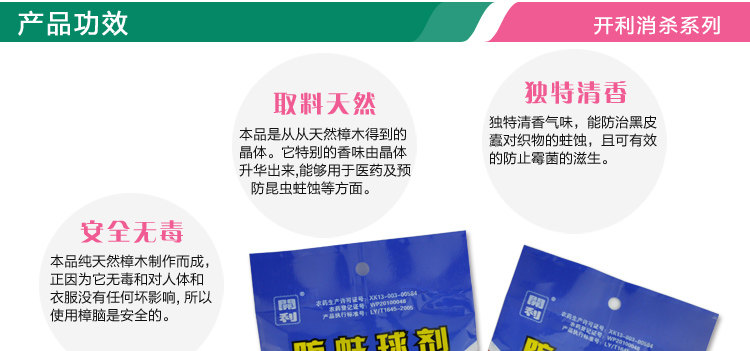 本品采用樟脑为原料。本品低毒,主要防治对象:黑皮蠹。适用于各类全毛、全棉、混纺、化纤织物等的防蛀。