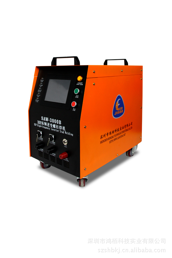 金螯 SAW-3000B型DSP高频逆变短周期拉弧式螺柱焊机,该成套设备主机采用IGBT逆变技术和DSP控制技术,自带2把焊枪,可实现手动送料、人工焊接;自动送料、人工焊接和与机器人连接的全自动焊接。该设备的最大焊接电流可达1500A。