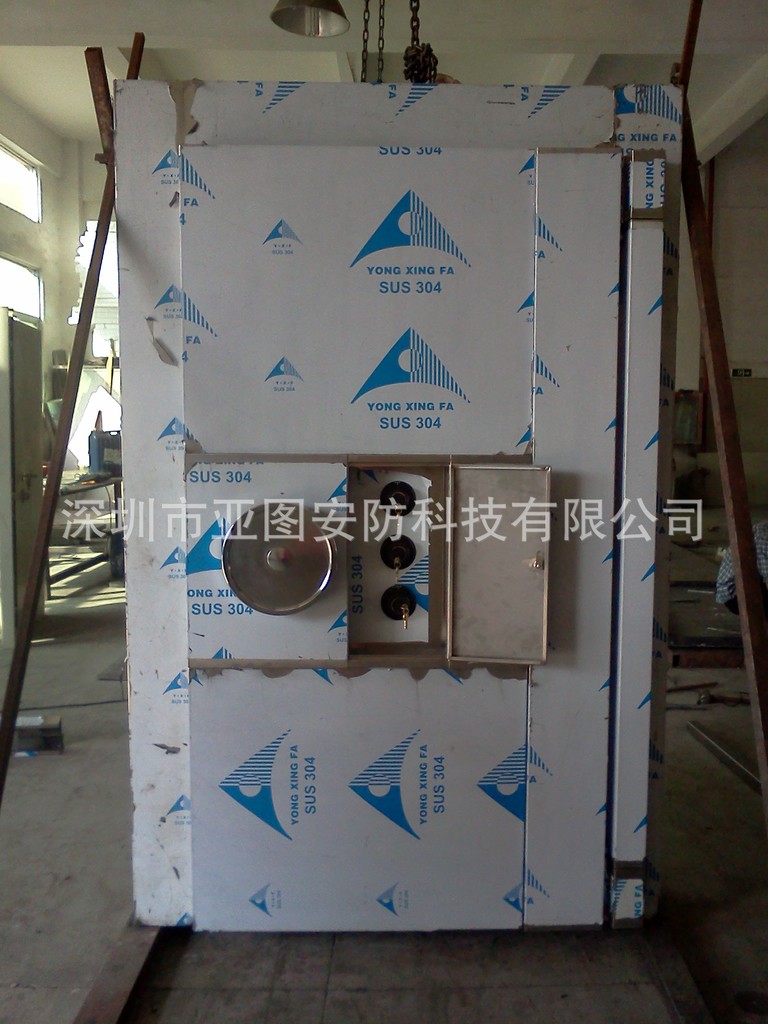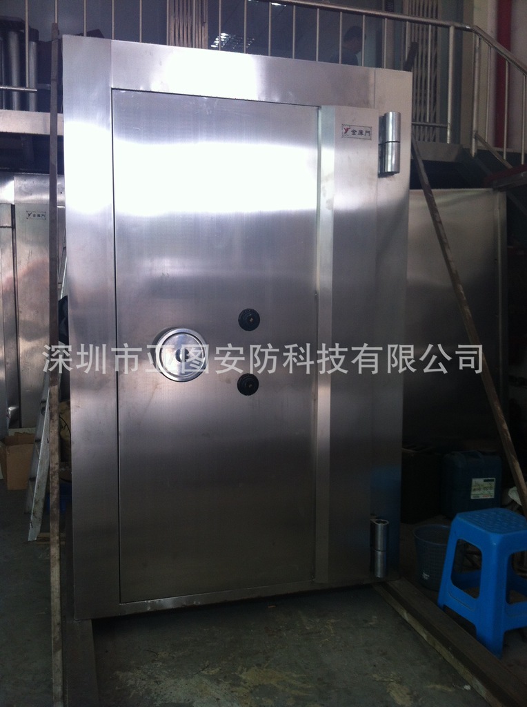 二、组成及结构特点 该金库门主要由主金库门、应急门(紧急情况下用于金库管理人员进入金库的第二通道)、栅栏门也叫日间闸门(作用是为正常开库后提供适当防护)、组合锁(均符合JR/T0002-2000《组合锁》标准要求)、门栓开合机构等组成。结构特点如下: 1、该产品门为多层板结构,外层门板为厚8毫米304碳钢板,内板为4毫米,中间框为160毫米槽钢焊接而成,中间填充防钻、防火材料和防切割板厚度为20毫米,当钻、冲击时,材料硬度可以达到H R C>8 0以上,气割时该材料会形成高铬氧化物阻止助燃。门扇整体经过机械加工抛光处理精度高、外形美观。 2、门面与门框有两个40mm的明铰链连连结(铰链轴为40mm)。 3、金库门传动机构材料为45#优质钢,经粹火镀铬处理提高了材料硬度及耐磨程度,门扇开启侧设计有4个活动门栓其直径可达30mm,锁舌伸出长度为30毫米,并以齿轮传动控制门栓滑动部分采用ZQSn6-6-3锡锌铝青铜以增加使用寿命并注入润滑油池,滑动灵活,定位准确。 4、金库门锁采用中国人民银行总行指定的机械密码锁一把和一个百叶连动专用双头锁一把组合成双锁门禁机构,更加坚固安全。也可根据用户需要增加时间指纹锁或电子智能锁。 5、门铰链设计结构,铰链侧装有4个直径为24mm的固定门栓,连接部分为内藏式,不易被任何工具破坏,轴与衬套是采用压力轴承和推力轴承相结合,相对摩擦系数小、转动灵活,使用寿命长。 6、设有安全重锁装置:当库门受到气割破坏时,重锁装置起作用,将门闩锁死,即使库门锁定机构被破坏,库门也不被开启。 7、本金库门的应急门材料与主体门一样优秀,同时装有密码和百叶式双锁头连动锁,形成双锁结构,加强了防盗性能,也为紧急情况下管理人员出入金库提供了方便。 8、日闸门在设计上采用优质20×20×20钢管焊接而成,且装有隐蔽式防盗门锁,在金库门开启后,日闸门起到第二道防护作用。也可以安装TM卡电子防盗锁,使管理人员进出更加方便联系电话13825292922 0755-26433389 向小姐