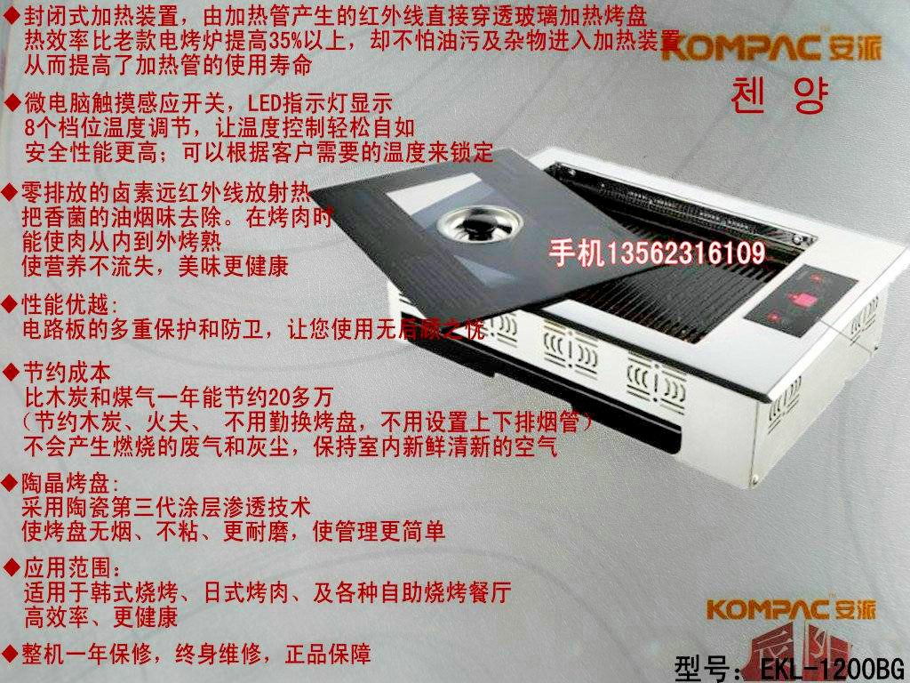 KOMPAC碳纤维红外线的最大的特点是能使烤盘均匀受热,使肉从内到外均匀烤熟,烤肉又嫩又有水份,最大的保持肉中蛋白质、碳水化合物等有益营养成份,并具有低脂肪、低胆固醇的特点,食用更健康。使用本产品更方便、卫生、环保、操作简单、安全耐用,是烧烤餐厅最理想的烧烤工具 ,同时可用于家庭休闲烧烤、商用烧烤和户外旅行烧烤等。