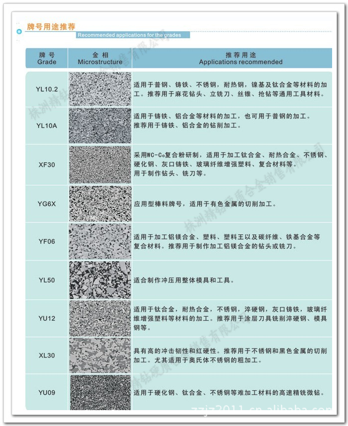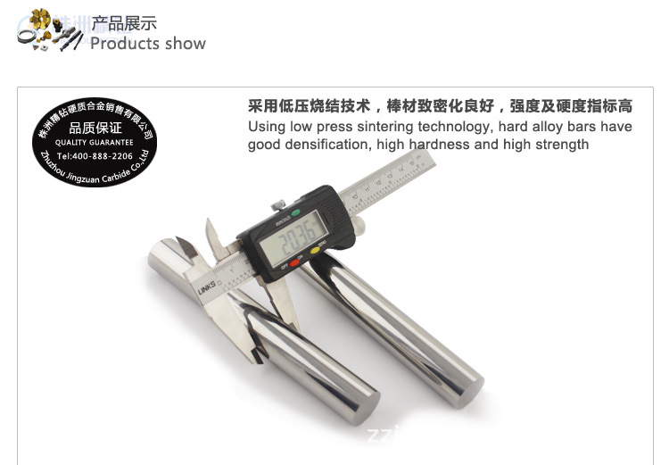 我公司生产的硬质合金棒材根据不同的用途分为很多种类。主要用于制作各种整体硬质合金工具,加工耐热合金等,也可制作加工PCB的微钻。YL10.2、YL50的牌号棒材适合制作冲压用整体模具和工具。制作加工玻璃纤维、木材、塑料、纸以及黄铜、铝合金等的整体硬质合金工具需采用YU06的牌号。制作φ0.8mm以下的微钻和制作其他整体硬质合金工具需采用YU08的牌号。制作硬质合金芯棒及耐磨零件就采用YG8即可。制作加工PCBφ3.2-6.3mm的大直径钻头和φ0.8-3.2钻头和铣刀,以及制作加工铝合金、塑料、塑料王以及碳纤维等符合材料的各种整体硬质合金刀具需采用YF06的牌号。