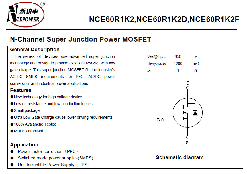 原厂供应超结MOS管NCE60R1K2,NCE60R1K2D,NCE60R1K2F /600V 4A