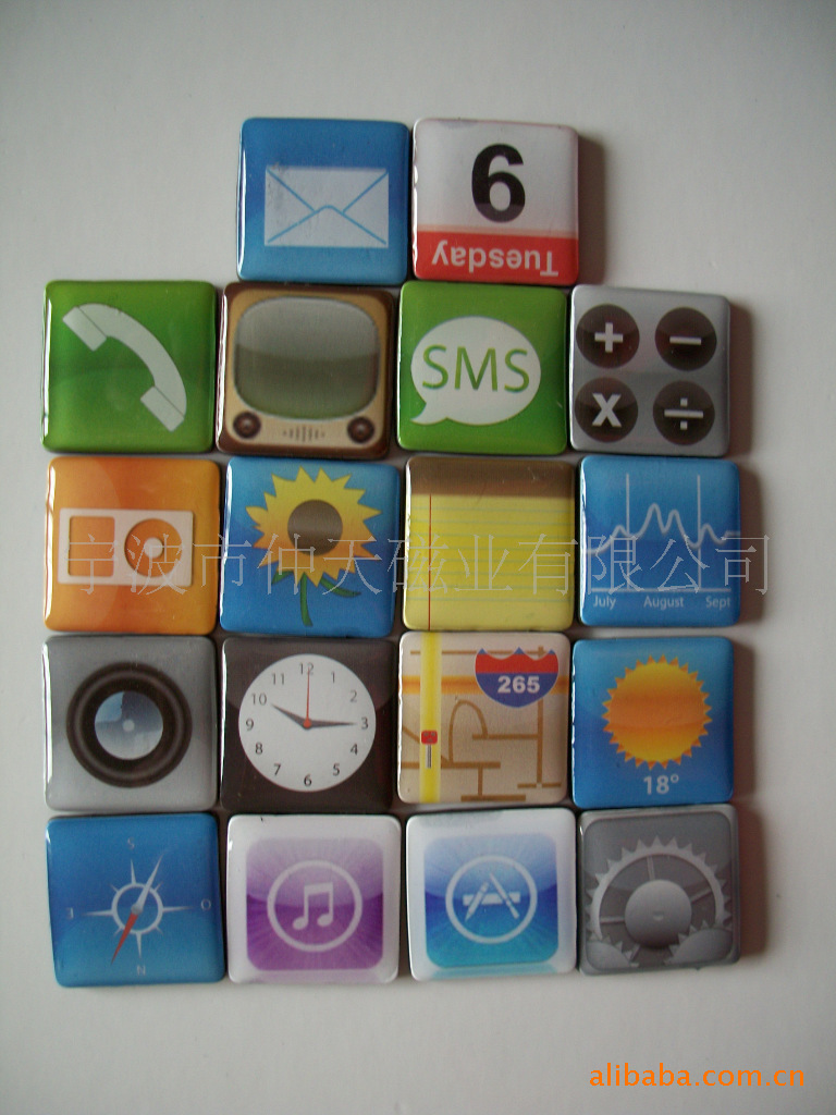 9)玻璃冰箱贴:采用下面软胶磁铁+上面铜版纸彩色印刷+半圆玻璃窗腹膜制作而成