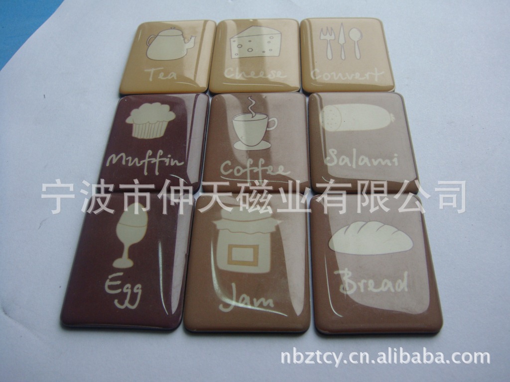 10)滴胶冰箱贴:采用下面软胶磁铁+上面铜版纸彩色印刷+滴胶腹膜制作而成