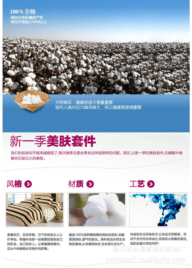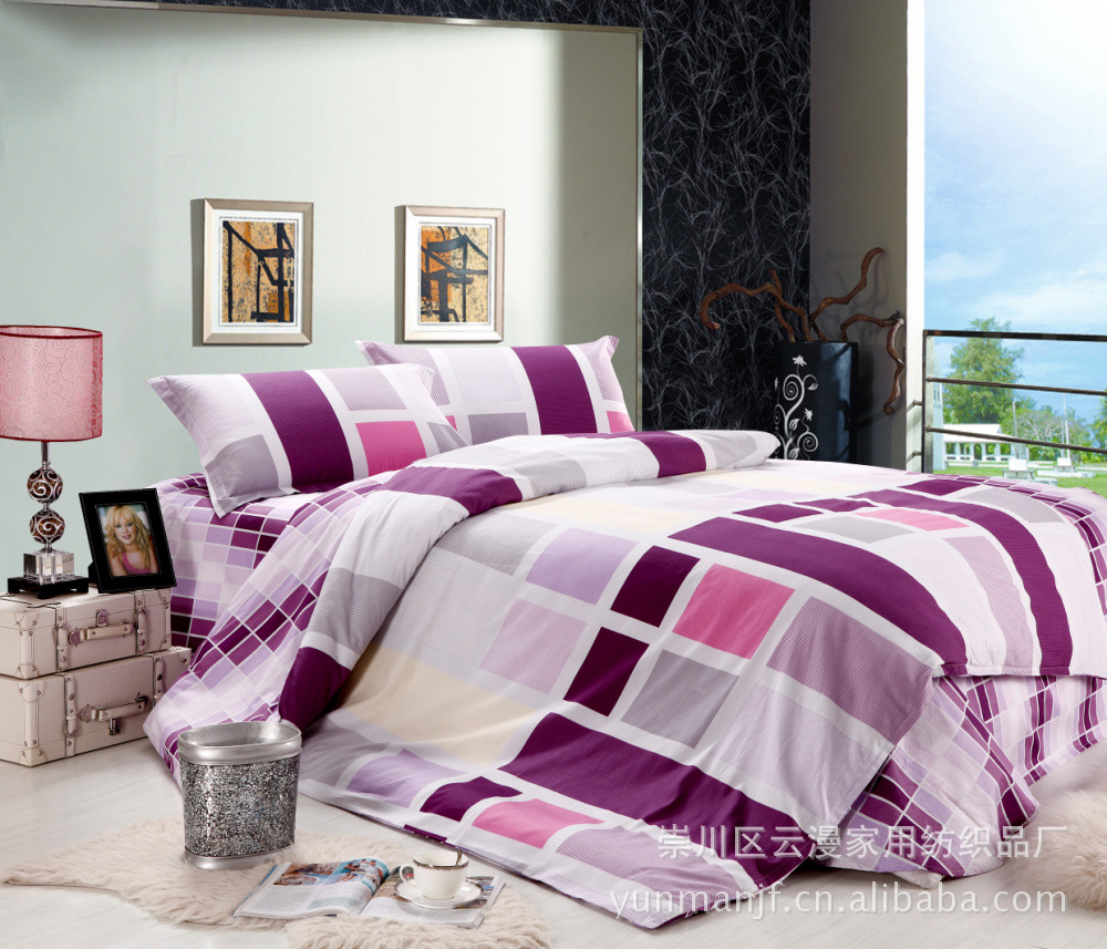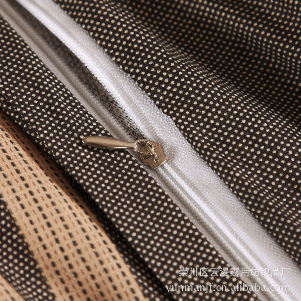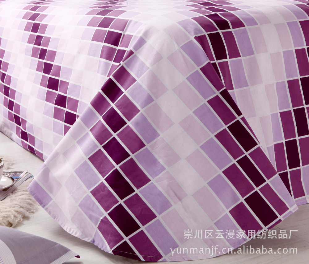 结构Structure:床单四件套:被套200×230×1,床单230×250×1,枕套48×74×2 工艺面料Fabrics:40支纱纯棉斜纹、半活性印花 重量Weight:2.2kg 包装Package:简包装 产品特性Introduction:纯棉斜纹,吸湿及亲肤性很好,摸起来柔软舒适,品质感油然而生;活性印花,使得设计与床品融为一体,凸显档次;繁华的设计非常的出众,营造出超炫的感觉! 【产品名称】:全棉环保AB版印花四件套 【规格】:被套200*230cm 床单(圆角)230*250cm 枕套(信封式)45*70cm*2 枕套花型一般为被套面料随机裁剪,就是枕套有可能会是被套的任何一个地方。 【适合范围】:适合于被子为200*230的。标准套件,适用床大小为:150*200cm 180*200cm 的床。由于床单为230*250的,用在1.8米的床上挂边较少。 【产品洗涤说明】:全棉面料,深色的第一次水洗会有浮色现象,注意不要用热水或开水洗涤,并且第一次浸泡不要超过10分钟,如果方便,适当加一点食用盐。