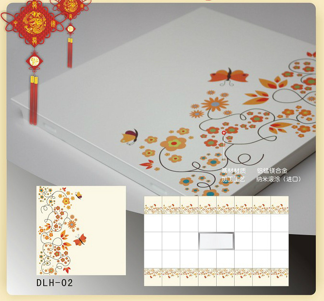 信和天花扣板为滚涂板采用铝镁合金原料,材质纯净,硬度及韧性强,吊顶长年使用不下沉、扣板不变形。引进德国磷化技术使铝板表面磷化,经过3道重复磷化工序,产生强烈的视觉效果,呈现出鲜活亮丽的艺术魅力。表面工艺采用高级生漆作为漆料,所用油墨含独特的SE(硒)含量色彩保密配比,色彩清晰鲜明度饱满,永不褪色,极大提升艺术天花的艺术张力和画面表现力。