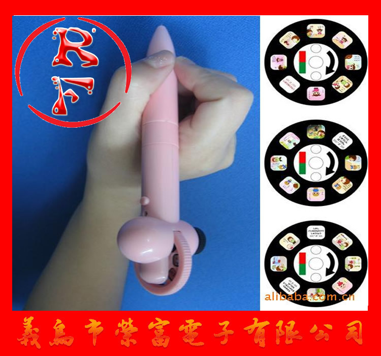 LED8图投影笔,内含三个AG13电池,笔内含有一个轮盘,轮盘上面可以放8个不同的图案,只要一按开关,就可以投出你想要的图案来,当你转动一格轮盘时,图案都不一样,笔身也可以加印客人的LOGO,这是一款最佳的广告促销礼品笔之一。。。