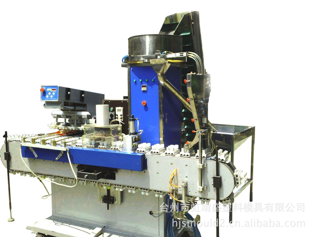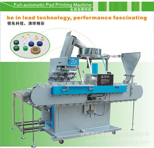全自动移印机配表面高频处理机,是瓶盖表面印刷图样的专用设备,具全自动理盖、送盖、分道、进盖、表面处理、油印脱盖为一体,实现了自动化加工.图为四色全自动移印机,附38公位"坦克链"型运输带.