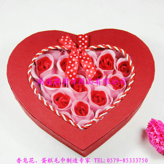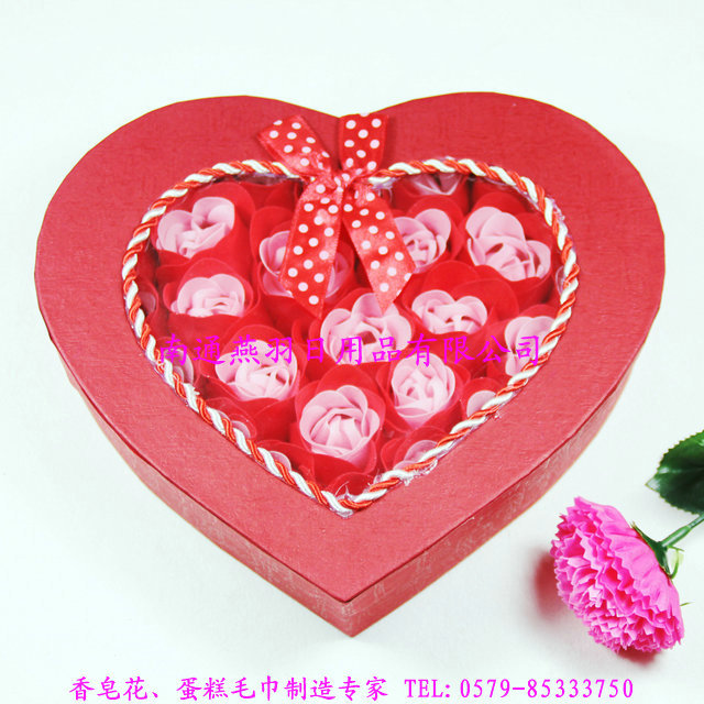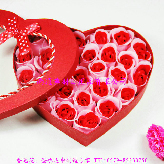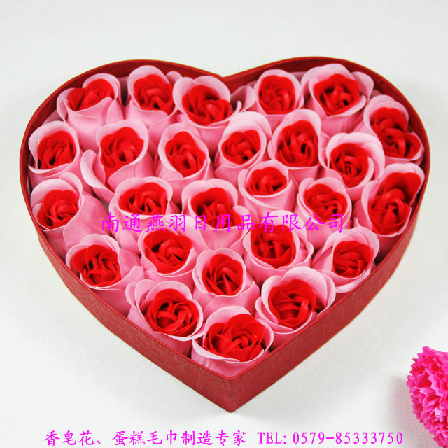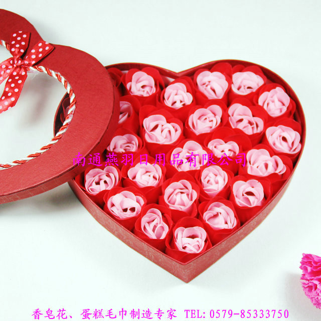 品名:26朵心形套色+绳边+蝴蝶结-香皂花礼盒
