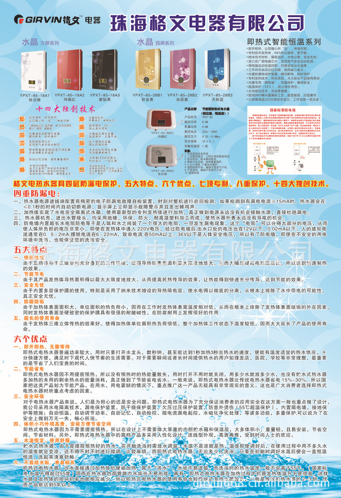 四、体积小巧,外观高贵,安装方便,节省空间。公司研发即热式热水器在外观设计做到体积小,重量轻,且易安装,节省空间、节省材料,并采用人性化设计,流线型外观,高贵典雅,受到时尚人士的欢迎。