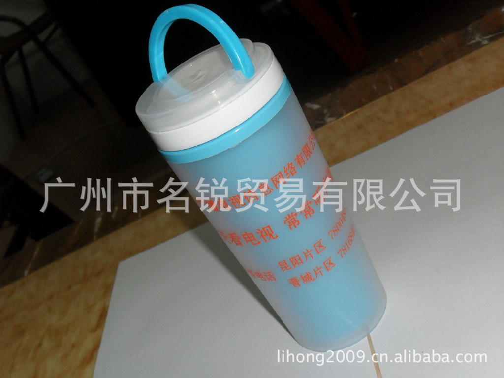 产品名称:提手密封杯。规格:18*7*6CM 材料:食品级PP 风格:双层。 印刷:单色。 包装:独立的OPP袋。夏季清爽磨砂设计风格;手提式设计,方便携带;人性化设计储藏格,根据各人所需不同放置不同储物;双层真空密封设计,高效保温,保冷
