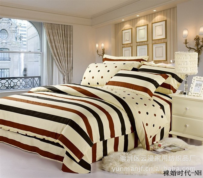 结构Structure:床单四件套:被套200×230×1,床单230×250×1,枕套48×74×2 工艺面料Fabrics:40支纱纯棉斜纹、半活性印花 重量Weight:2.2kg 包装Package:简包装 产品特性Introduction:纯棉斜纹,吸湿及亲肤性很好,摸起来柔软舒适,品质感油然而生;活性印花,使得设计与床品融为一体,凸显档次;繁华的设计非常的出众,营造出超炫的感觉! 【产品名称】:全棉环保AB版印花四件套 【规格】:被套200*230cm 床单(圆角)230*250cm 枕套(信封式)45*70cm*2 枕套花型一般为被套面料随机裁剪,就是枕套有可能会是被套的任何一个地方。 【适合范围】:适合于被子为200*230的。标准套件,适用床大小为:150*200cm 180*200cm 的床。由于床单为230*250的,用在1.8米的床上挂边较少。 【产品洗涤说明】:全棉面料,深色的第一次水洗会有浮色现象,注意不要用热水或开水洗涤,并且第一次浸泡不要超过10分钟,如果方便,适当加一点食用盐。