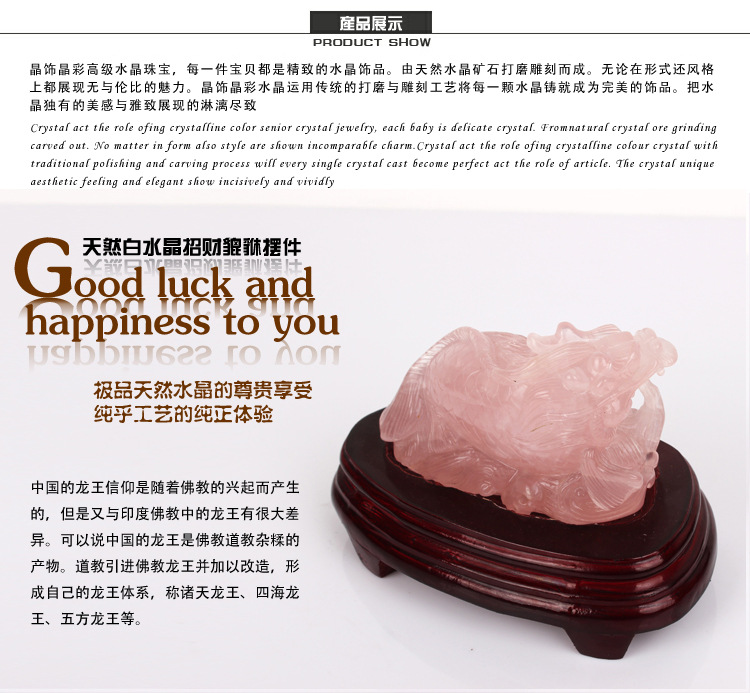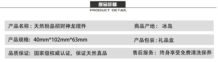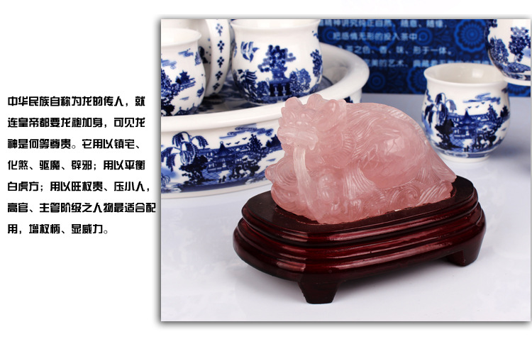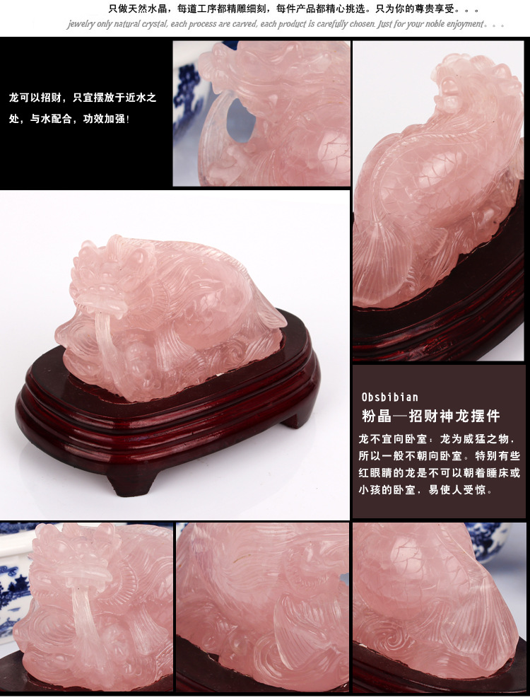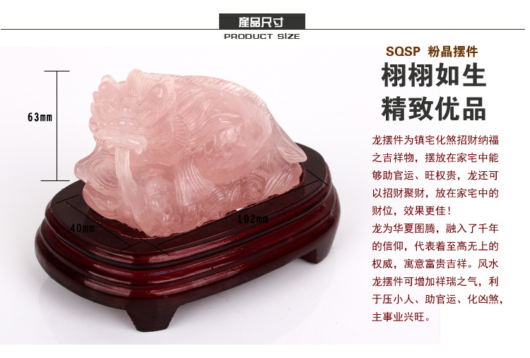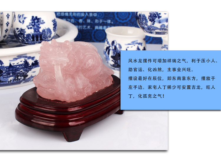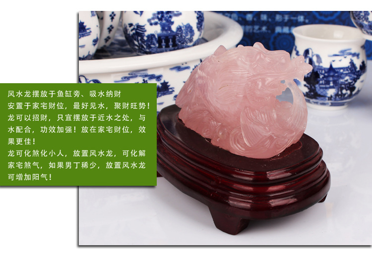 产品介绍: 首先分成盖上人际关系、增加财运与化煞两大种。可以在家中左手的墙壁上或置物桌朝向大门处,摆上一对风水龙,会有助财运。如果是开店营业者也是可以如法炮制,不过假如是摆在鱼缸上会更加良好,会有助财运。当然在住家或营业处附近有大水域,像是河流、湖泊...等;一定会使得财源广进,除此之外事业也能蒸蒸日上。假若还是没有这些有利环境的话,则也可考虑家中的北方,因为北方在五行中被归为水。这里需要注意一点,必须考虑合适的大小,因为过大的风水龙在此,反而会有耗财、无事生灾的现象。结合自己需要摆放的空间大小来选择对应的风水龙规格。 若是为了化煞,则必须依照龙的特性来摆设,才能发挥出百分百的能力。不过如果是穿心煞、路煞的话,就不是很适合。由于龙有一种君王气势,有着极高的权威与威震感,所以对那些污秽、阴气、邪暗有着强烈的聂震作用,像是屠宰场、墓园、殡仪馆、垃圾场等。除此之外,像是附近有警局军营、监狱等肃杀之气较重的地方,风水龙也可以发挥其灵动力化解。而龙气会籍的地方,必然是人旺的地方,所以像是住家附近有寺庙、精舍...等地方,都会有一股孤克之气,此时我们只要再朝向这些地方摆上一对风水龙,化解煞气,如此能让家人的精神状态趋向良好,也可以改善生活品质。