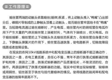 拉负荷跌落熔断器增加了弹性辅助触头及灭弧罩,用以分合负荷电流。跌落式熔断器在正常运行时,熔丝管借助熔丝张紧后形成闭合位置。当系统发生故障时,故障电流使熔丝迅速熔断,并行成电弧,消弧管受电弧灼热,分解出大量气体,使管内形成很高的压力,并沿管道强烈纵吹,电弧迅速被拉长而熄灭。熔丝熔断后,下部静触头失去张力而下翻,使缩紧机构释放熔丝管,熔丝管跌落形成明显的开断位置。当需要拉负荷时,用绝缘杆拉开动触头,此时主动、静触头依然接触,继续用绝缘杆拉动触头,辅助触头也分开,在出头之间产生电弧,电弧在灭弧罩狭缝中被拉长,同时灭弧罩产生气体,在电流过零时,将电弧熄灭。