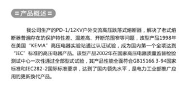 跌落式熔断器适用于频率为50HZ、额定电压为35KV及以下的电力系统中,装在配电变压器高压侧或配电之干线路上。主要功能有对保护性能要求不高的地方,它可以与隔离开关配合使用,代替自动空气开关;还可以与负荷开关配合使用,代替价格高昂的断路器。同时还具有短路保护、过载及隔离电路。