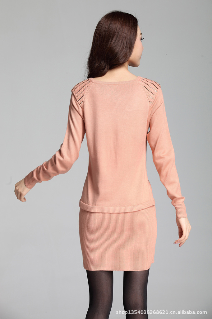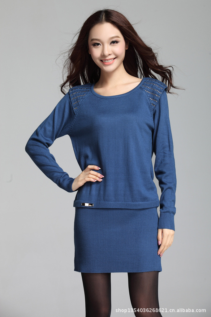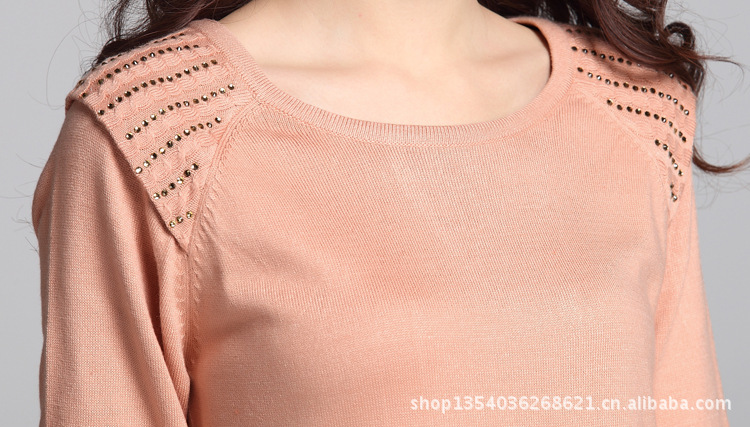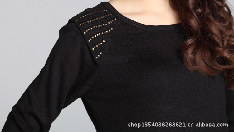 2012新款韩版拼接螺纹摆针织衫 时尚烫钻修身中长款女式毛衣68052