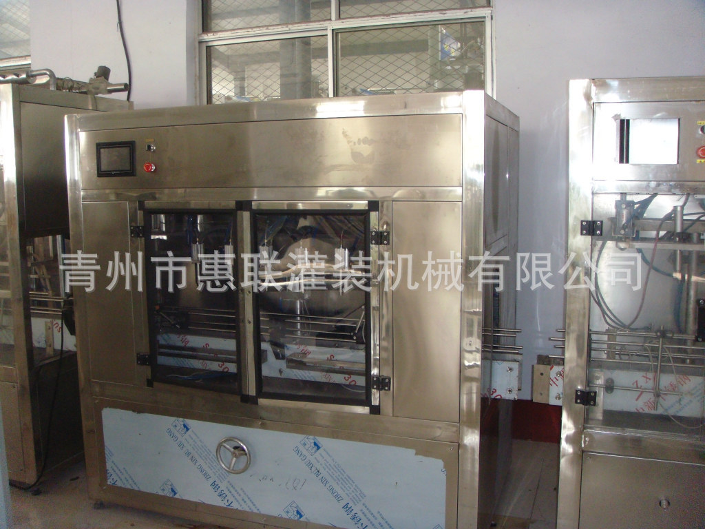 适应液体:各类有浓度高粘稠度的液体 1、独特的专为不滴漏而设计的多款式灌 装头及回吸系统,确保生产现场及包 装成品不受液料污染; 2、3‰高精度的流量计配以进口进口PLC电脑控制的全彩色触摸屏人机界面,确保容量之调整简易、快捷、准确。是任何形式的容积灌装机所不及 的; 3、灌装瓶距、瓶高调节方便 ,灌装倾角可在0~45间专门设计制作,以适应斜口瓶之灌装; 4、灌咀冲液形式有斜冲式或直冲式,以适用不同液性的灌装,斜冲式适应易起泡沫的液料,灌咀定位形式有插入式或悬空式、以适应不同灌装高位的产品; 5、行星锥盘无级调整器驱动的不锈钢平板输送带,灵活地协调多工序的同步; 6、光电跟踪,程序自控,采用欧姆龙等世界名牌可编程序控制器,使程序更为灵活; 7、全自动/半自动气动压盖装置适应性广,气动旋盖为不同规格,不同形状地旋盖设计,旋压可靠; 8、主气动及电器原件均采用进口配件,确保系统能稳定,品质卓越; 9、供液形式可采用高位槽或泵压送液,泵压送液大幅度地提高了生产能力; 10、可配套高效率由磁感应封口装置,铝箔封口防潮止溢,大大地提高了产品的商品档次。晶体管封口装置独到的感应板及冷却系统使得安全高效,封口效果极佳。