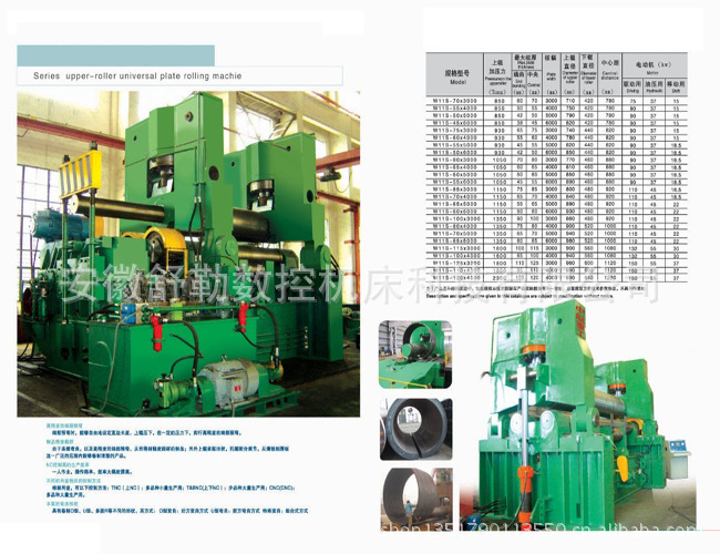 ◎船用上辊万能式卷板机 W11NC-16X6000大型超宽系列上辊万能式卷板机是目前亚洲的船用卷板机,船用上辊万能式卷板机具有预弯功能,上辊垂直升降、水平移动采用液压传动,水平移动采用柱赛液压缸结构,结构简单,加工、安装方便,机架与大梁、上辊装置之间采用调心装置。 船用上辊万能式卷板机底盘采用铰制螺柱联接,便于加工等等。建立超宽大型卷板机上辊设置压辊、大梁的数学模型,上辊预置鼓形,下辊下部设置托辊配合调节,工作辊挠度控制在1/3000*L(工作面长度)以下,提高了制品的直线度。控制部分采用HMI(人机界面)控制技术,HMI是近年发展的替代传统的控制面板和键盘的智能化操作、控制显示器。 ◎船用液压对称卷板机性能特点: 1.全钢焊接结构,设备刚性强,并采用计算机有限元计算分析法进行优化设计计算; 2.轴辊两端全部采用可调心球轴承; 3.轴辊由中碳钢经锻造及调质处理后进行精加工; 4.卷板机两下辊有支承辊;提高卷制工件精度及机器整体性能。 5.采用电气集中控制,操作简单、方便; 6.控制台采用人性华设计,操作简便方便; 7.集中润滑系统。 ◎技术参数 规格型号 | W11NC-16*6000 | W11NC-30*13000 | 可卷板厚 | 端曲 mm | 12 | 25 | 中央 mm | 16 | 30 | 板 幅 mm | 6000 | 13000 | 屈服极限 mpa | 245 | 350 | 卷板速度 m/min | 4 | 3 | 满载最小半径 mm | 600 | 1000 | 上辊直径 mm | 560 | 680 | 下辊直径 mm | 260 | 440 | 上托辊直径 mm | 220 | 400 | 下托辊直径 mm | 200 | 360 | 下辊中心距 mm | 420 | 650 | 主电机功率 KW | 37 | 110 | 液压电机功率(1) KW | 15 | 55 | 液压电机功率(2) KW | 5.5 | 11 |